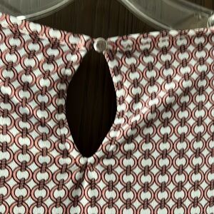 Liz Claiborne sleeveless blouse. Size Medium. The color is white with rose colored circle pattern. Pleated in the front and a one silver button close in the back.