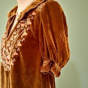 Elegant velvet tunic featuring intricate embroidery & outstanding detailed gathering along shoulder area and sleeves, across back…just immaculate gathers in the velvet in these areas.