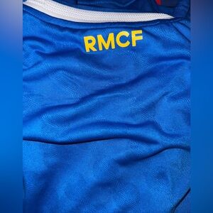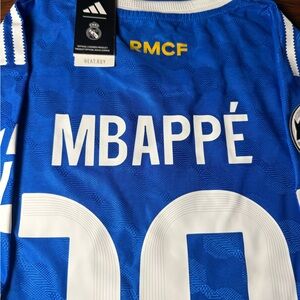 Bold blue jersey with Real Madrid crest. Adidas logo and sponsor details included.