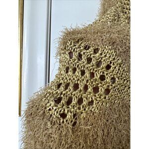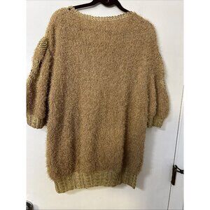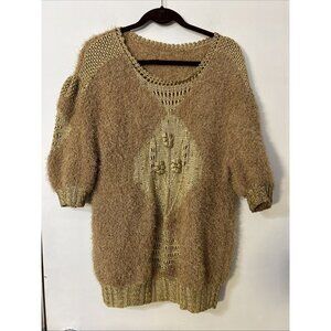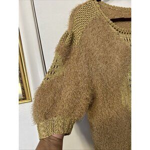 VTG Sweater Crochet Handmade Gold Brown Short sleeves 3d Flower Eye Lashes