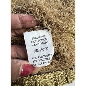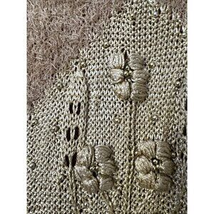 This is a vintage handmade sweater in gold and brown, featuring crochet work with 3D flower details on the short sleeves. The size is L/XL, and the material is polyester. It has a unique Secretary/Geek style and is original in design. The country/region of manufacture is not specified. Please refer to the pictures for more details.