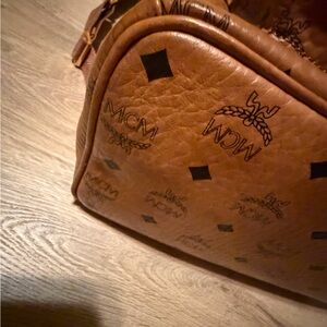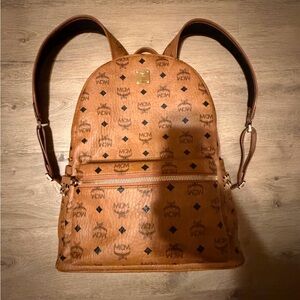 Elegant MCM backpack in tan leather. Features iconic logo pattern. Spacious and stylish for daily use.