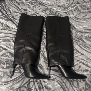 Elegant black leather boots with pointed toes. Ideal for a fashionable look.