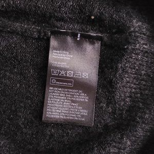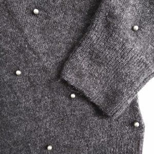 Chic dark gray sweater. Features pearl accents. Perfect for layering.
