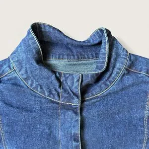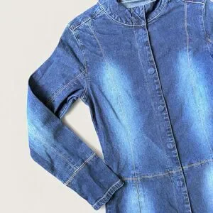 Classic early-2000s Arden B denim longline dress or jacket. Slim shape with princess seams, button front, midweight denim, and a mandarin-style collar. Wear alone as a dress or layered open as a duster.