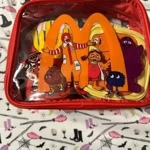 Set of 3 retro style McDonalds pouches/ makeup bags/ carrying cases, featuring 80’s/90’s style character art. A larger clear pouch featuring Ronald and the other mascot characters, and two smaller pouches shaped like a French fry container and a box of chicken McNuggets. Loungefly-type product, but unsure of the manufacturer.