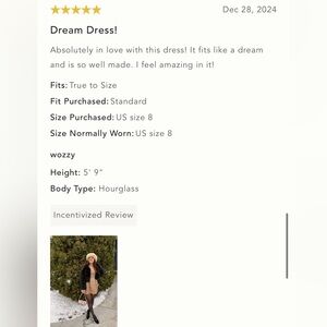 Love this dress! It fits like a glove, for reference I'm 5'3", 120lbs athletic build. I love the details and elevated material making for a great choice to wear to a festive holiday or special event.