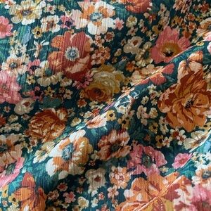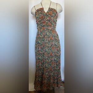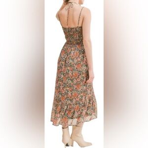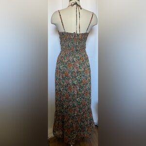 Embrace elegance with this floral midi dress, perfect for any occasion. The dress features a beautiful blend of colors, adding a touch of sophistication to your wardrobe. Adjustable spaghetti straps. Self tie halter top with smocking in back and ruching in front. Dress is lined. Feminine and romantic. There is a small touch of metallic thread (hard to see in photos). Perfect for summer nights!