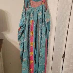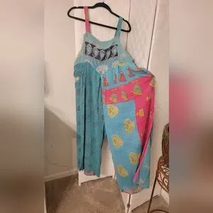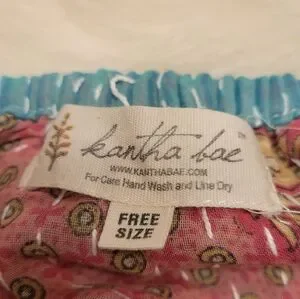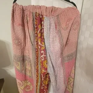 This piece doesn't stop! Incredibly comfortable. Soft, colorful and winning. I love Kantha cloth. It is made by hand and extremely delicate. This has pockets and ties in the back. Wide comfy legs. Designed to fit up to size 24.💛