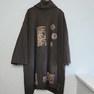Blue Fish coat features a rich brown hue and a relaxed, oversized silhouette. it offers warmth and style with its wide lapel collar and full-length sleeves. The coat is adorned with unique decorative elements near the hem.