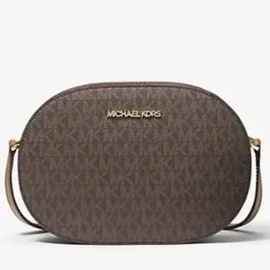 Michael Kors Jet Set Travel Medium Logo Crossbody Bag in brown signature-print canvas. This bag features a chic, geometric (oval) silhouette with gold-tone hardware, an adjustable crossbody strap, and a top-zip fastening.
