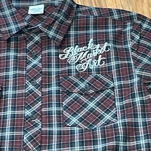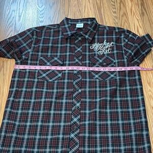 Men’s Dead End Black Market Art Skull Shirt, short sleeve button up plaid, XL