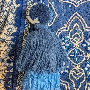 Stylish blue patterned tote bag with intricate hand beaded designs. This tote is so stunning in person. It's big, measuring 14x12.5" It has a detachable hand beaded strap.
