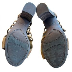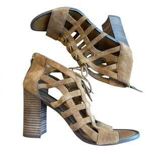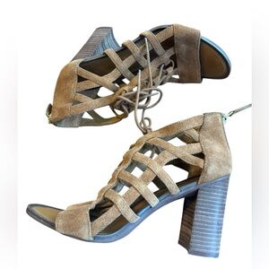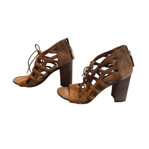 Franco Sarto Cognac Carmel Brown Suede Tie Front Cut Out Wooden Block Heel Size 6.5