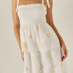 Elegant white tiered dress with charming yellow floral accents. Perfect for any occasion.