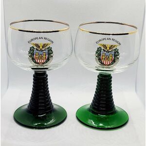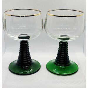 Pair German Wine Glass Goblet Gold Trim Green Swirl Stem, European Region.