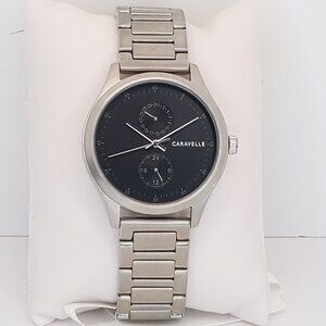 Sleek precision with a contemporary edge. Minimalist-design hour markers on black sunray dial and five-hand multifunction feature with date and 24-hour sub dials. Stainless steel case and bracelet with double-push fold-over closure. This watch is new in the box and works perfectly.