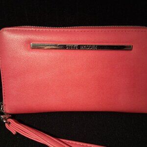 This is a Steve Madden BZIP zip around wallet wristlet in dark pink or coral. The wallet features a zip around closure and a prominent Steve Madden logo metal bar. This wallet is known for its multiple card slots and compartments, suitable for organizing all your essentials like credit cards, cash,and it can handle a checkbook. The wallet measures 8" x 4.5" x 1" with a 14" strap. The callouts are marks on the piping in a few places, they show as white spots.