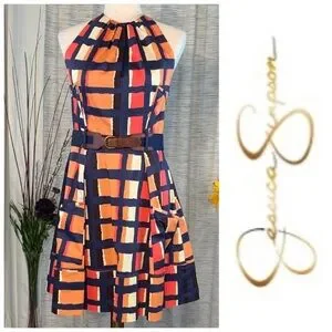 Jessica Simpson multicolored (blues, orange, red, brown and white) blocks halter dress.