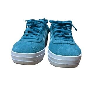 The Adidas VL Court Bold Kids in size 6.5 and Women's 7.5 are stylish chunky platform sneakers perfect for both activewear and casual occasions. These blue suede shoes feature a low top shaft style with a lace-up closure, making them easy to wear. With a comfortable cushioned insole and standard shoe width, these sneakers are designed for all-day wear. The athletic style and solid pattern add a sporty touch to the 90s-inspired design, suitable for various seasons and activities. Made by adidas, these shoes combine fashion and functionality for a trendy look.