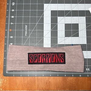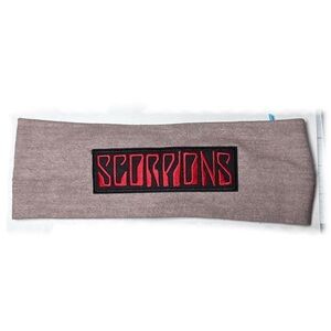 Stylish headband featuring 'Scorpions' in bold red on gray fabric. Perfect for fans and casual wear.