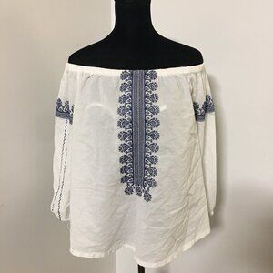 MADEWELL White Blue Cotton Off Shoulder Peasant Embroidered Blouse Top Small