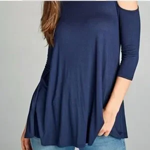 Fabulous cold shoulder swing top in classic navy blue. Perfect with red jeans or regular blue jeans. 95% RAYON 5% SPANDEX. Add to bundle to save! (B2)