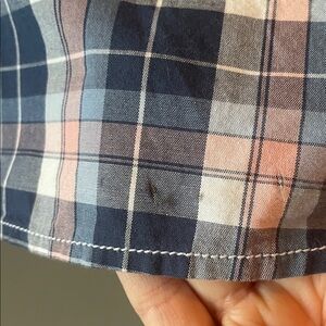 Stylish plaid shirt featuring a classic button-down design. Perfect for casual outings. Colors are blue, pink and white. 100%. Small stain at bottom of the shirt on left side. Please see pictures. Would not be visible if shirt is tucked in.
