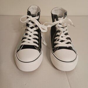 Trendy and eye-catching black high top sneakers featuring beautifully embroidered crane bird nature detailing. A perfect blend of sporty and feminine style with cushioned comfort, lace-up design, and a standout aesthetic. Women’s size 7 in brand new with tags condition — stylish, versatile, and ready to elevate casual outfits.