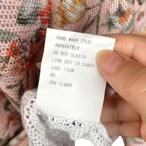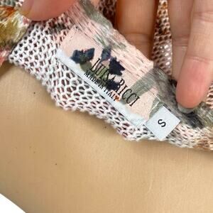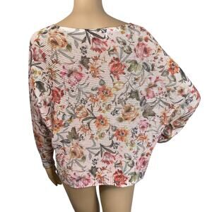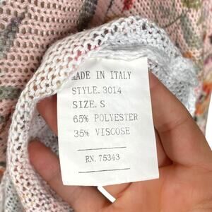 This sweater by Luisa Ricci was made in Italy and is a pull on style with wide boat style neck and dolman/batwing sleeves. It has an allover colorful floral print. It is a slightly loose knit style (semi-sheer) with lots of stretch. Fabric is a poly/viscose blend. Sweater has minimal wear, is in great condition! Super feminine !