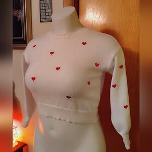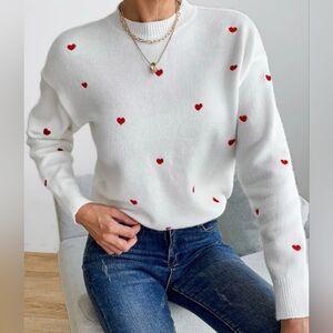 Charming and cozy, this elegant white sweater features playful red heart details across the front. A perfect blend of cute and classic, ideal for everyday wear or seasonal outfits. Designed with a comfortable crew neckline and soft knit feel.
