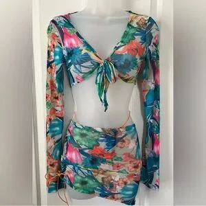 Vibrant floral mesh two-piece set with long sleeves and tie front. Features a colorful pattern with blue, pink, and green hues.