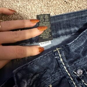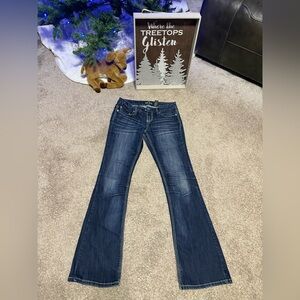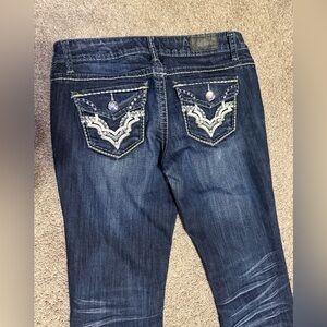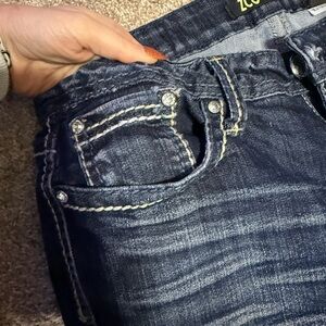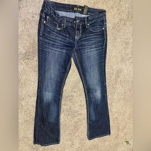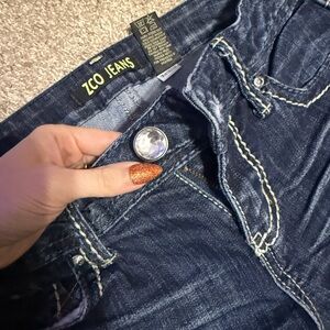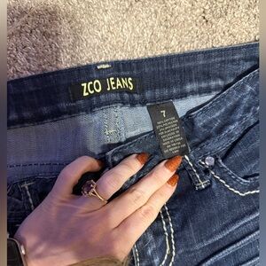 Dark wash with fade bootcut jeans by ZCO. Low rise. Saddle stitch with no missing gems.