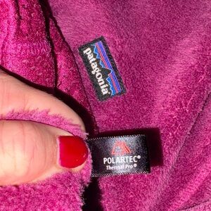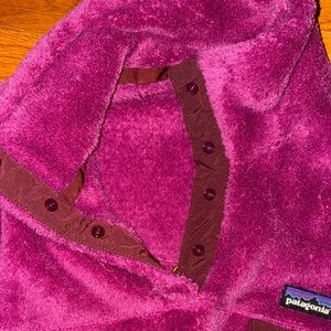 Warm rosehip berry color fleece jacket by Patagonia. Features a high collar and chest pocket, quarter length snaps, pullover-Polartec thermapro