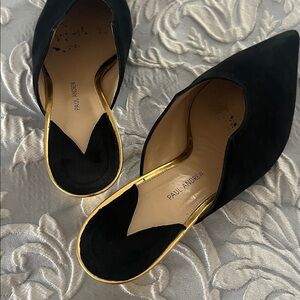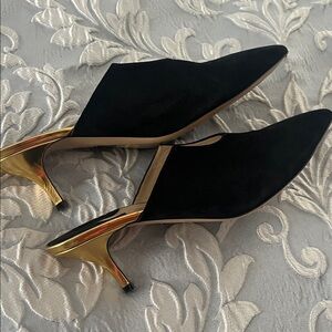 Chic black mules with a sleek gold kitten heel. Perfect for adding elegance to any outfit.