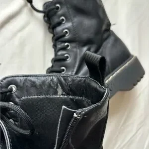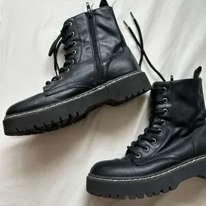 Chic black moto boots with sturdy soles. Lace-up design for a bold look.