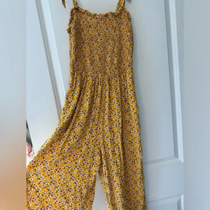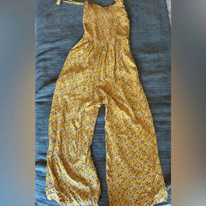 Yellow Floral Hollister Jumper size small. Yellow material with floral pattern. Sleeveless style jumpsuit. Smocked section along bust. bow details along straps. 22 inch inseam. Viscose material. Has pockets!!