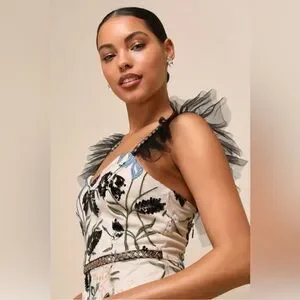 Chic midi dress with black and blue floral design. Ideal for elegant events. Worn once, in excellent condition. NO RETURNS FOR SIZING, SO PLEASE ASK FOR MEASUREMENTS BEFORE PURCHASING.