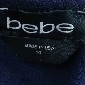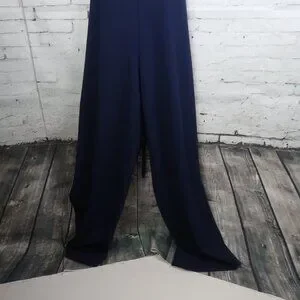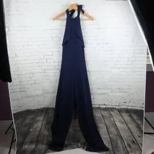 NAVY BLUE HIGH NECK HALTER RUFFLE OPEN BACK WIDE LEG JUMPSUIT SIZE 10 BY BEBE PRE OWNED NO FLAWS