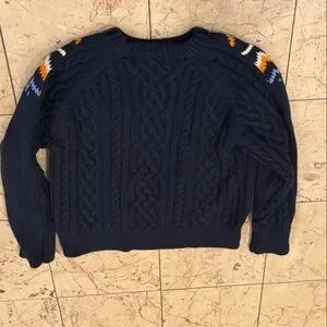 MAKE YOUR BEST OFFER ON THIS: Thick navy sweater with bold orange and white geometric designs. Perfect for a trendy outfit. (Worn twice). Warm and cozy, depending where you are, on a mild winter day, you can wear this with a vest or light coat. It is THAT warm!