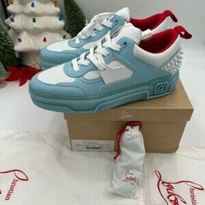 Step out in style with these Christian Louboutin Astroloubi low-top sneakers! These chic sneakers feature a light blue and white design, perfect for adding a pop of color to any outfit. The iconic red interior and signature spikes add a touch of Louboutin flair.