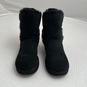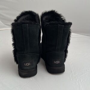 UGG Classic Short Fluff High-Low black winter boots. Style 1103746. Fluffy Toscana fur spills over the top of these suede boots enhancing the warm and cozy feel. Super versatile style. Lightweight flexible outsoles. Round toe. Pull on. Excellent condition. Smoke free home