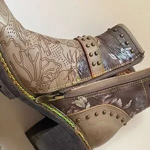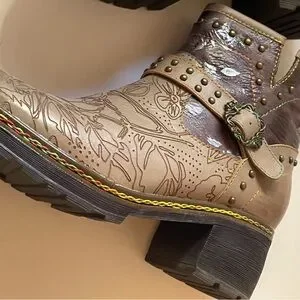 Elegant taupe ankle boots with intricate embossing. Features studded straps and side zipper. Perfect for a stylish look.