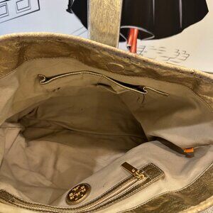 A casual staple goes big city glam when Tory Burch uses metallic leather to create a tote! With leather straps, magnetic snap closure, goldtone hardware, plus lined interior with zip and cell pockets along with 2 huge side pockets. This tote is in very good condition. No rips, no tears, no stains, no marks Dimensions: 20"L x 7"W x 13"H. 8" handle drop.