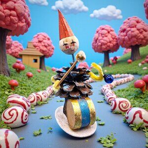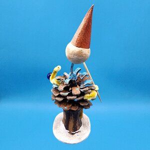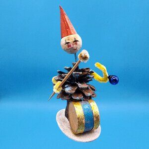 This delightful 1950s Japan bobblehead elf ornament brings mid-century charm to any holiday display. Crafted with a spun cotton head, jaunty pointed hat, chenille arms, and playing a drum, this clown-style elf balances atop a textured pinecone body. One hand holds a blue mercury glass bead ornament, adding a sparkling pop of vintage color.