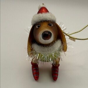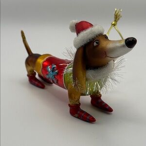 Celebrate the holidays with this happy smiling charming dachshund ornament, featuring vibrant red, green, brown and gold colors. Perfect for dog and doxie lovers and festive decor.