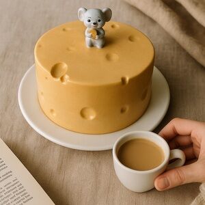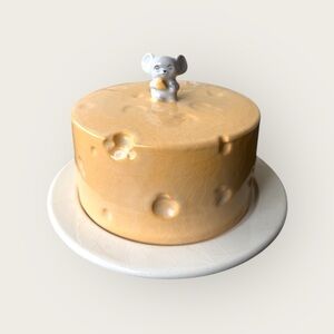 Unique cheese-themed cake dome featuring a cute mouse figurine on top. Perfect for adding charm to your kitchen decor.