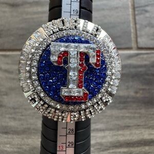 Texas standers Josh Jung sparkling replica silver championship ring with blue and red accents. Perfect for sports fans. Collect the entire series. Never worn. See images for details and size. The ring was taken out of the clear plastic to measure. It has been re-wrapped. Comes with box. Smoke free home.