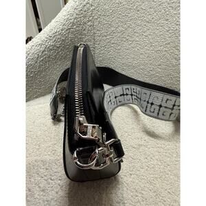 Authentic Givenchy Mini Antigona crossbody bag in black leather with silver-tone hardware. Features a sleek, structured silhouette with the Givenchy logo subtly embossed on the front. The interior is lined with Givenchy-branded fabric and includes a slip pocket for organization. Comes with an adjustable and detachable Givenchy logo jacquard strap for versatile wear. Secure top zipper closure. Perfect for everyday essentials or an elegant evening look.