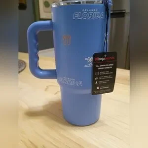 24oz stainless steel travel tumbler. Double wall vacuum insulated. Keeps drinks hot or cold for hours. Features Orlando Florida design.